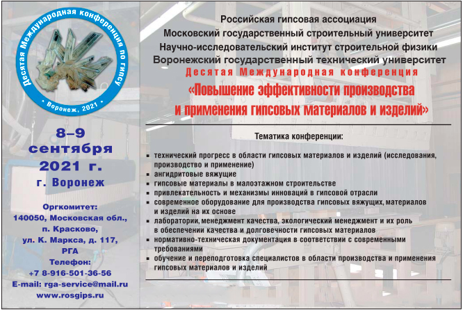 10-ая Международная научно-практическая конференция «Повышение эффективности производства и применения гипсовых материалов и изделий» состоится 8-9 сентября 2021 года в отеле «Voronezh Marriott».