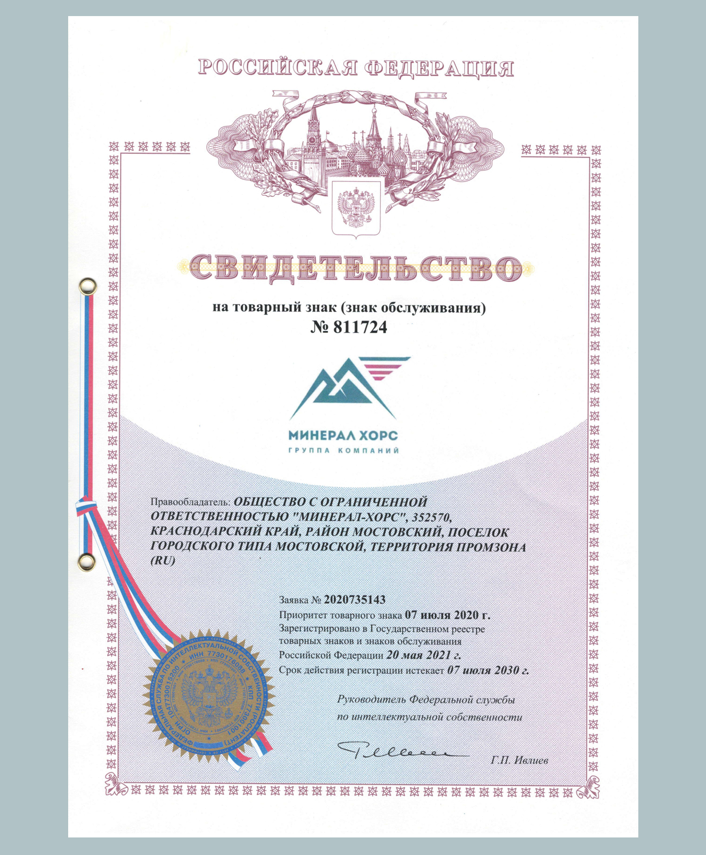 Свидетельство подтверждает, что «Минерал Хорс» является правообладателем данного бренда, и что наш логотип является официальным товарным знаком.